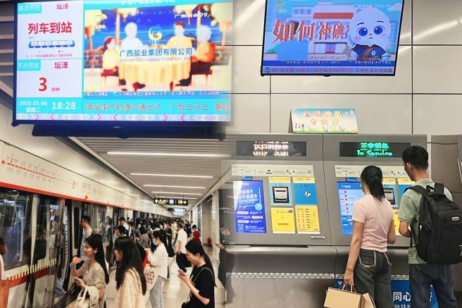 聯(lián)合廣西廣播電視臺精心制作《“鹽”續(xù)傳承》系列科普動畫片,生動科普碘缺乏病危害及科學(xué)用鹽知識,并在南寧地鐵1-5號線車載電視每日循環(huán)展播,形成流動的科普課堂。自2025年5月全渠道展播以來,累計觸達(dá)客流超980萬人次,為鞏固防治成果厚植群眾基礎(chǔ)。